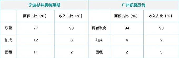 第一,在奧特萊斯經營模式中,無論是面積占比還是收入占比,聯營模式都占絕對的多數;而購物中心因為是租賃制的,這一項無法直接對比;百貨只能從報道中推導出結論。