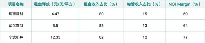 租金坪效已經達到成熟期標準,寧波杉井奧特萊斯尤為突出,NOI Margin(凈營業收入邊際,也即凈營業收入與重資產占比,反映運營效率,高值在65-80%)也全部在60%以上。